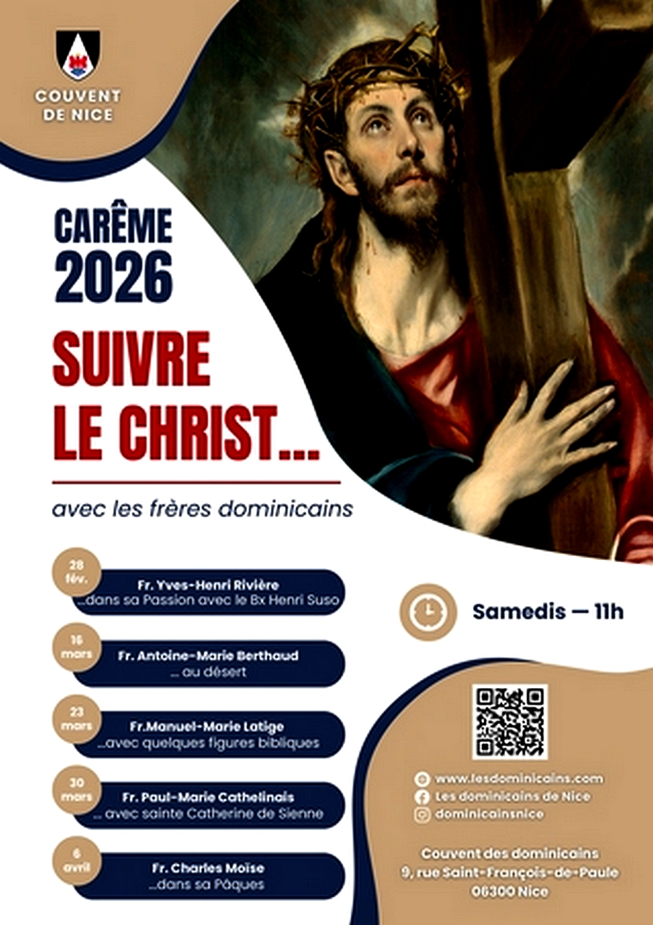 CARÈME 2026 Suivre le Christ... avec les frères dominicains 1er samedi 28 février, 11h Suivre le Christ dans sa passion avec le Bienheureux Henri Suso Fr. Yves-Henri Rivière 2e samedi 16 mars, 11h Suivre le Christ au désert Fr. Antoine-Marie Berthaud 3e samedi 23 mars, 11H Suivre le Christ avec quelques figures bibliques Fr. Manuel-Marie Latige 4e samedi 30 mars, 11h Suivre le Christ avec sainte Catherine de Sienne Fr. Paul-Marie Cathelinais 5e samedi 6 avril, 11h Suivre le Christ dans sa Pâque Fr. Charles Moïse![]()